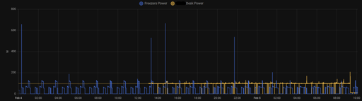 The PC itself was drawing ~90 watts. The current draw right now - dual 1080p monitors, HA server, a 5-port switch, and a couple other small things - is about 12 watts. Desk power measurement is the yellow line, freezers are the blue line.