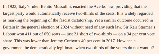 Valnao@sh.itjust.works to Today I Learned@lemmy.worldEnglish · 1 month agoTIL that Benito Mussolini, enacted the Acerbo law, providing that the largest political party would automatically receive two-thirds of the seatssh.itjust.worksimagemessage-square5linkfedilinkarrow-up1167arrow-down14